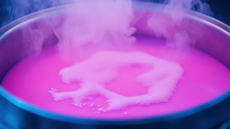 A bright pink liquid simmers in a stainless steel pot, releasing steam and creating a captivating culinary scene rich with vibrant colors and textures.