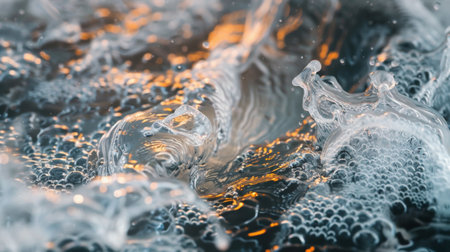 A close-up of water bubbles with golden light reflections, creating a mesmerizing and dynamic abstract pattern with blue and orange tones.