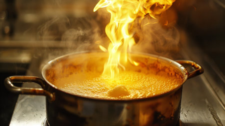 A dramatic scene in the kitchen featuring flames and steam rising from a pan filled with crispy fried food, showcasing the culinary process and mouthwatering appeal.