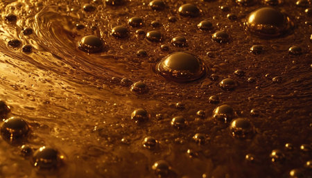 This macro showcases a dynamic golden liquid surface with distinct swirling patterns and a multitude of bubbles. Larger, prominent spheres sit alongside smaller ones, all catching the light with a lustrous sheen. The fluid appears viscous and rich, with streaks of lighter and darker amber tones creating a sense of movement. The dark background makes the golden hues and reflective bubbles stand out, creating an abstract and visually texture.