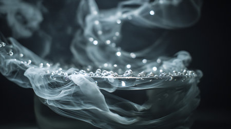 A mesmerizing plume of white smoke rises gracefully from a pool of liquid, creating a dreamlike and ethereal atmosphere. The soft, blurred background enhances the sense of mystery.