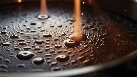 Vibrant close-up of boiling water being added to golden oil, showcasing steam and bubbles in a metal pot, perfect for culinary and cooking themes.