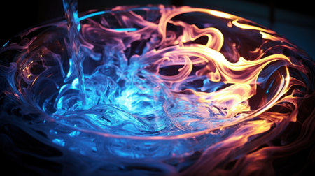 A bowl of liquid with blue and red flames in it, AI