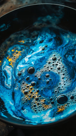 swirling blue and yellow liquid with bubbles in a dark bowl, abstract art concept