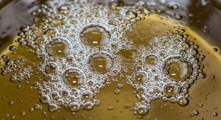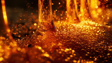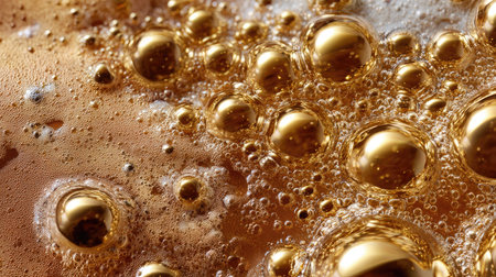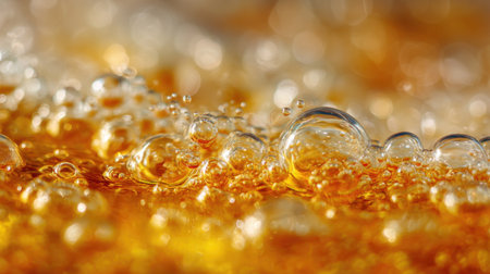 This captivating close-up image captures shimmering bubbles in amber liquid, showcasing vibrant golden highlights and soft foam, perfect for beverage themes.