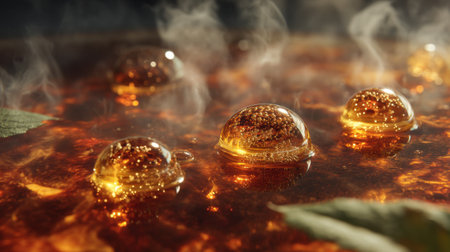 This captivating image features floating bubbles on a golden liquid surface, surrounded by gentle steam and green leaves. Perfect for artistic and creative projects.