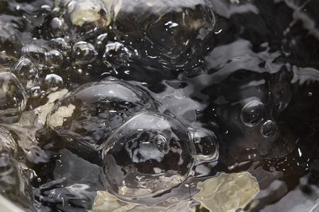 boiling water with macro bubbles close-up on black kitchen stove for cooking