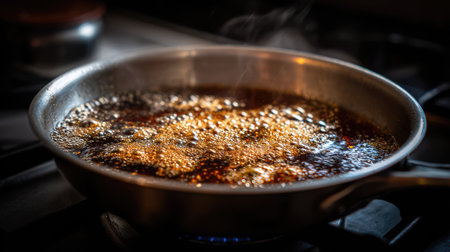 Close-up of caramelized sugar bubbling in a pan, showcasing the process of making homemade caramel sauce