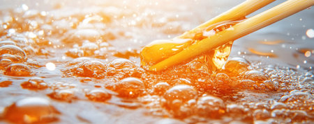 Witness a captivating close-up of chopsticks gracefully dipping into rich broth See the liquid swirl, a dance of texture and flavor This intimate view highlights the art of cooking, emphasizing the interplay between chopsticks and broth Indulge in this visual feast of vibrant colors and rich flavors today AI Generative