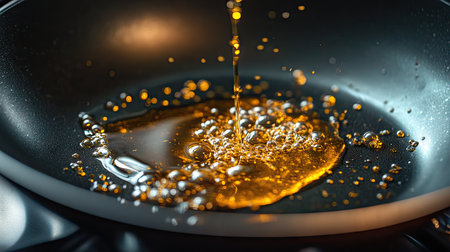An artistic close-up of golden oil being poured into a dark frying pan, capturing glistening reflections on the surface, highlighting culinary beauty.