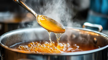 This image captures a close-up of bubbling liquid in a pot, showcasing warm colors and textures. The reflective surface adds to the cooking ambiance for culinary enthusiasts.