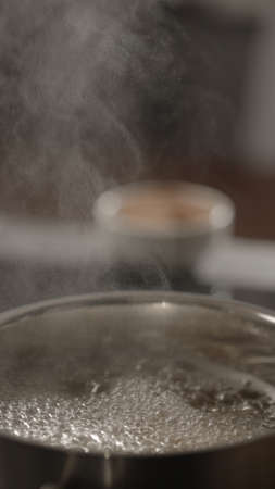 vertical shot pasta boiling in saucepan on induction stove