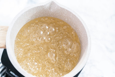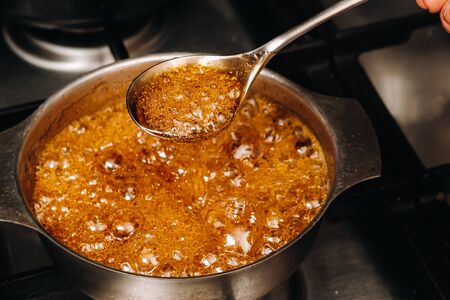 Boiling and boiling water and sugar in a pan on the stove. Cooking salted caramel at home. The recipe for homemade caramel and burnt sugar.
