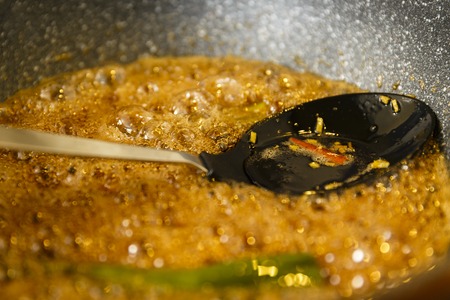 Green chili boiling along with caramelized sugar in a wok