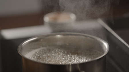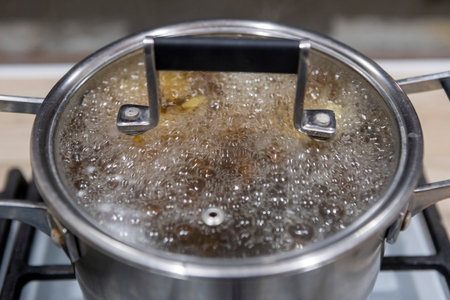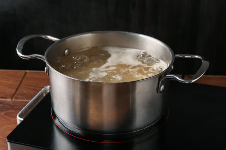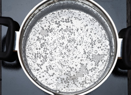 closeup water boiling in saucepan on induction stove