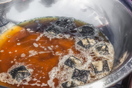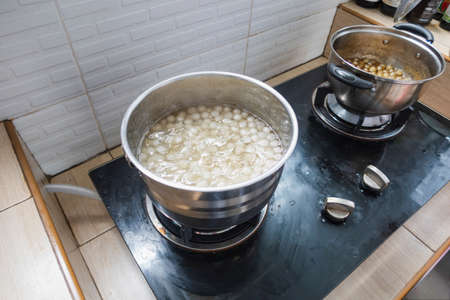Cooking, boiling brown sugar flavor tapioca pearl balls, ingredient of bubble tea, preparing food and drink, close up, recipe cookbook steps design concept.