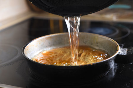 Pouring used cooking oil onto frying pan on stove