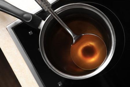 Saucepan and ladle with used cooking oil on stove, top view