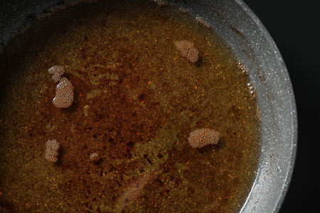 Hot boiling frying oil surface on pan background.