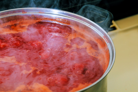 Home made strawberry jam being cooked up on stove.