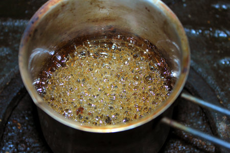 Preparation of sugar candies at home.A taste of our childhood.Rooster lollipops.Boiling Sugar caramel