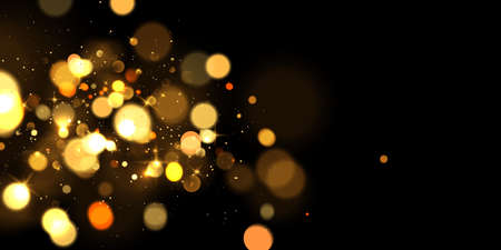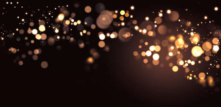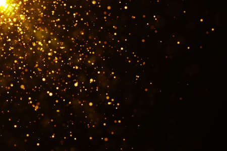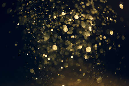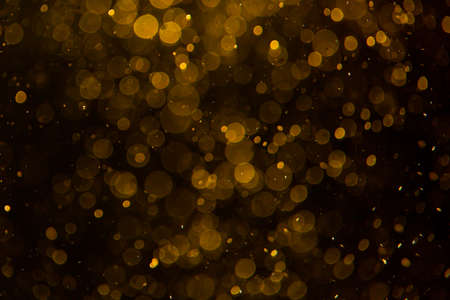 Christmas light and glow background. Abstract glitter bokeh and scattered sparkles in gold, on black