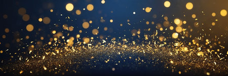 This mesmerizing image captures a shower of golden sparkle confetti, glistening like shiny glittering dust. The radiant and festive ambiance it creates makes it perfect for celebratory designs, party decorations, or any project that aims to add a touch of glamour and festivity