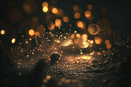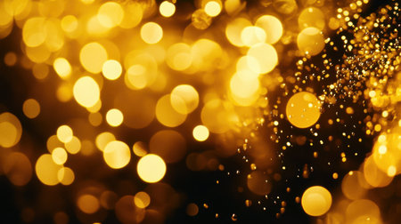Golden glitter falling on a black surface with sparkling bokeh lights