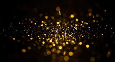 Abstract background shows a bokeh effect with a dark backdrop filled with many golden sparkles and blurred round lights, giving a festive and magical appearance.