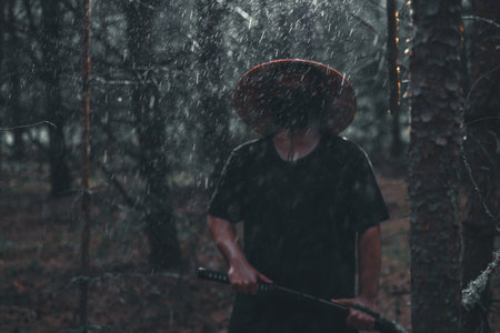 A mysterious samurai warrior with a katana stands in a dark forest during a heavy rain. The samurai holds the katana and exudes danger and power. The image combines history and fantasy.