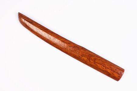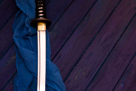 Katana sword and ancient paper scroll on the white wooden table background with copy space.