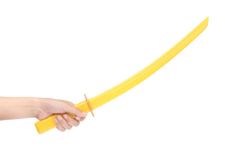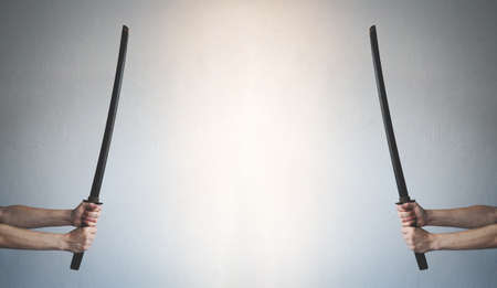 Male hands hold a katana on a gray background. A Kendo warriors with shinai in hands, preparing for kendo competitions. Space for text. Mockup banner.