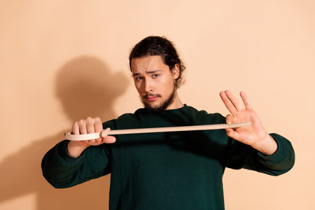 Young man with black hair stretching a bow against a beige background while making a gesture with an outstretched hand