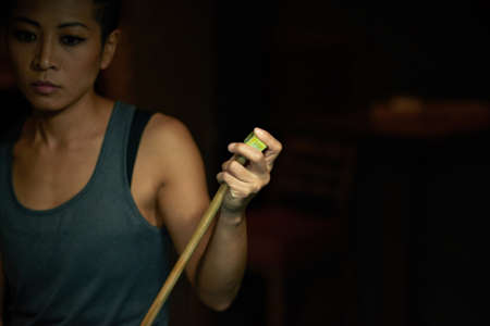 Chinese young woman practicing wushu kung fu with weapons outdoor. Young girl training martial arts form for the competition.