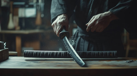 Katana sword master in action. Serious man wearing kimono training outdoor. Generative AI