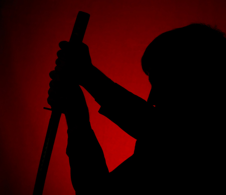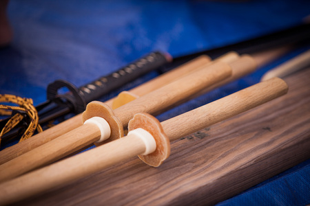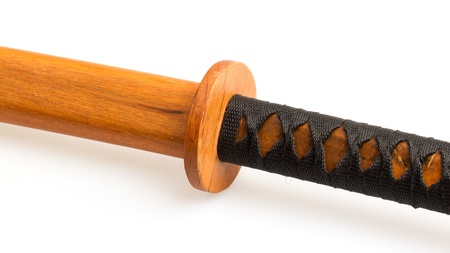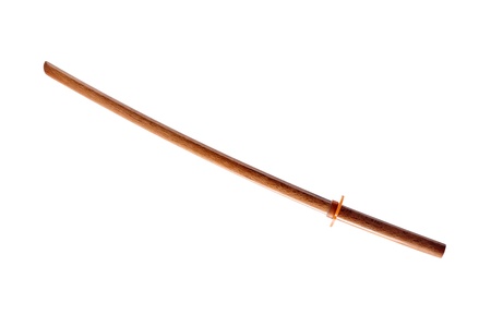 Aikido practicer (Aikidoka) with a training wooden sword (boken) dark dojo photo