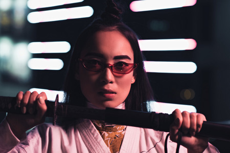 attractive asian girl in white kimono showing sword on street with neon light in evening, city of future concept