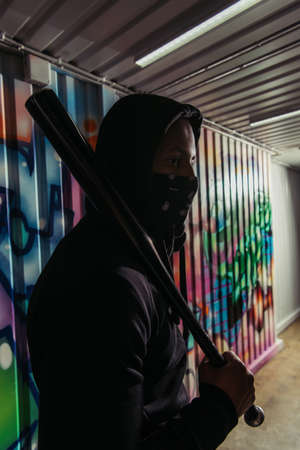 Silhouette of hooligan holding baseball bat under lighting isolated on black, banner