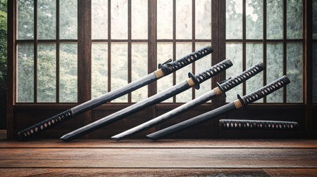 Set of three swords: katana, wakizashi, and tanto arranged in descending size, in front of a paper shoji screen
