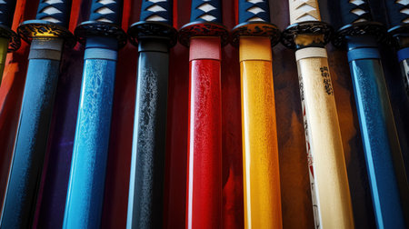 Modern interpretation of Japanese swords in various colors and styles, displayed vertically in a bright setting