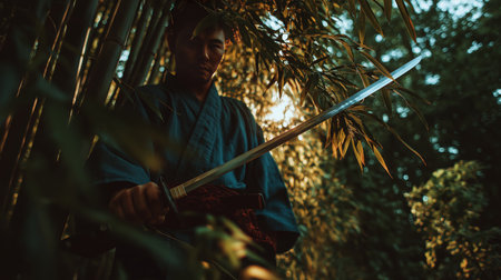 A warrior in traditional attire stands poised with a sword, surrounded by dense bamboo foliage