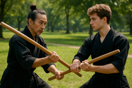 Martial arts master and young apprentice practicing fighting techniques with wooden sticks in a park