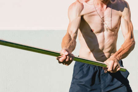Young karate guy is engaged in Wushu with weapons in the Park. Practicing self-defense with sticks
