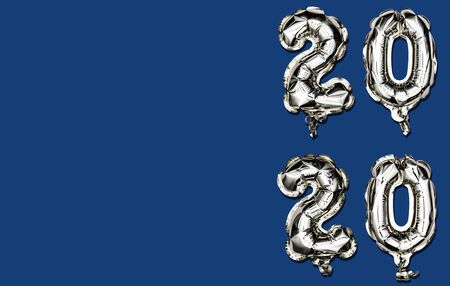 The new color trend of 2020 year. Vertical Christmas composition of number 2020 foil balloons on a classic blue background. Flat lay with copy space.