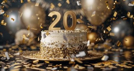 A white cake decorated with gold sprinkles and a 20 topper sits on a table surrounded by gold confetti.