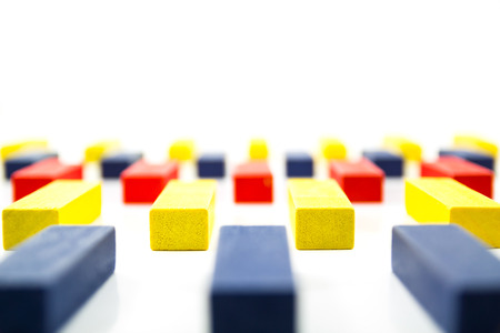 Top view of yellow background and colorful squares from cubes. Educational background for school, smartness, toy and puzzle