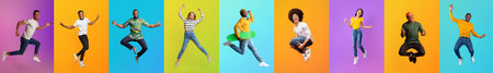 Summer people collection set, diverse people jumping on colorful background, many people funny jump wearing summer outfit fashion ready for swim and summer activity, summertime, beachwear AIG48