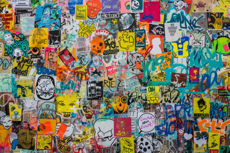 A lively display of colorful stickers and graffiti covers a wall, reflecting the creativity and energy of urban street art culture. Each piece tells a unique story and adds to the vibrant atmosphere.