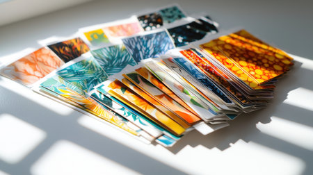 Vibrant Square Sticker Designs Spread Across Marble Countertop for Branding Concepts