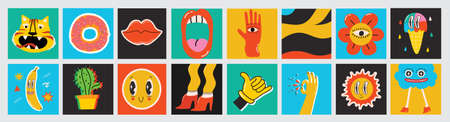 Big Set of Different colored Vector illustartion posters in Cartoon Flat design. Hand drawn Abstract shapes, funny Comic characters.